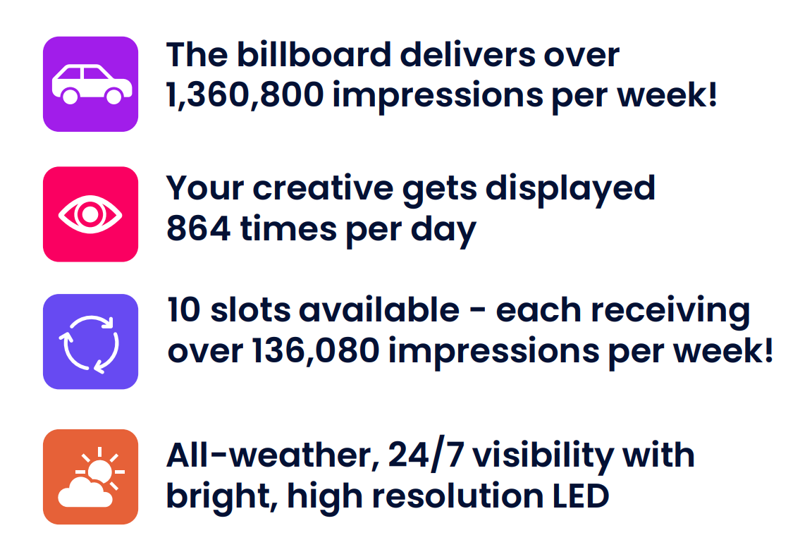 Our Billboard isn’t just high-tech, it is the only digital billboard on I-95. Each ad gets displayed about 864 times a day, which delivers over 1,360,800* impressions per week.